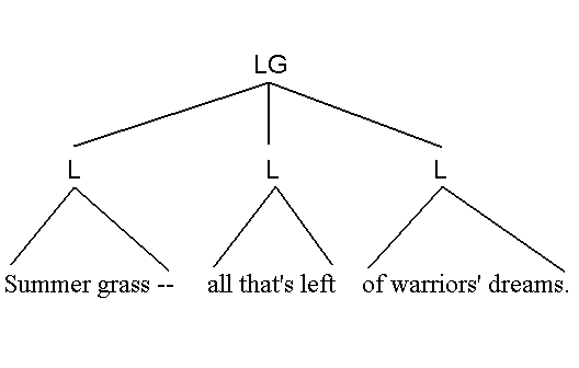 <lg> <l>Summer grass --</l> <l>all that's left</l> <l>of warriors' dreams.</l> </lg>
