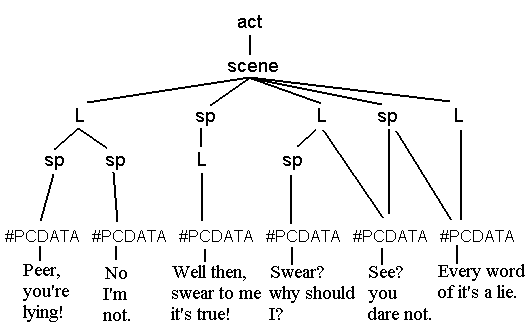 as shown in the <div1> tags.<sp who='Aase'><lb n="1"/> Peer, you're lying! </sp> <sp who='Peer'> No, I'm not! </sp> <sp who='Aase'><lb n="2"/> Well then, swear to me it's true! </sp> <sp who='Peer'><lb n="3"/> Swear? why should I? </sp> <sp who='Aase'> See, you dare not! <lb n="4"/> Every word of it's a lie! </sp>