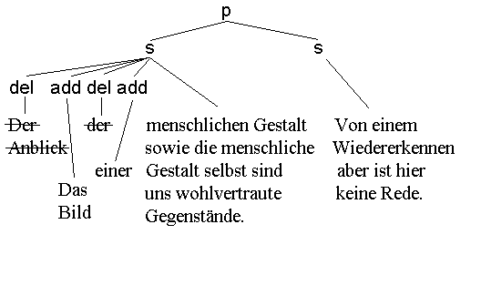 <p><s><del>Der Anblick</del> <add>Das Bild </add><del>der</del> <add>einer</add> menschlichen Gestalt sowie die menschliche Gestalt selbst sind uns wohlvertraute Gegenstände.</s> <s>Von einem Wiedererkennen aber ist hier keine Rede.</s></p>The start-tags mark the beginning of a passage characterized by some feature (e.g. being a paragraph, or having been deleted), the matching end-tags mark the end of the passage. In a markup language with conventional interpretation, the label on each node in the tree identifies some feature possessed by the subtree it dominates. Sometimes the feature is possessed by the subtree as a unit, as with the p element here; sometimes it is inherited by each part of the subtree, as with the del and add elements here.
